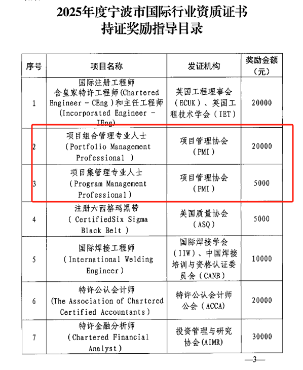 在2025年宁波市国际行业资质证书持证奖励指导目录中PgMP、PfMP赫然在目,奖金高达20000元。