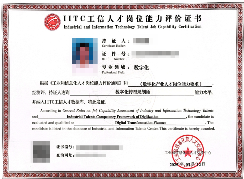 证书由工业和信息化部人才交流中心颁发,在行业内具有权威性,是个人在数字化转型领域专业能力的有效证明,被不少企业认可,能为职业发展增添优势。